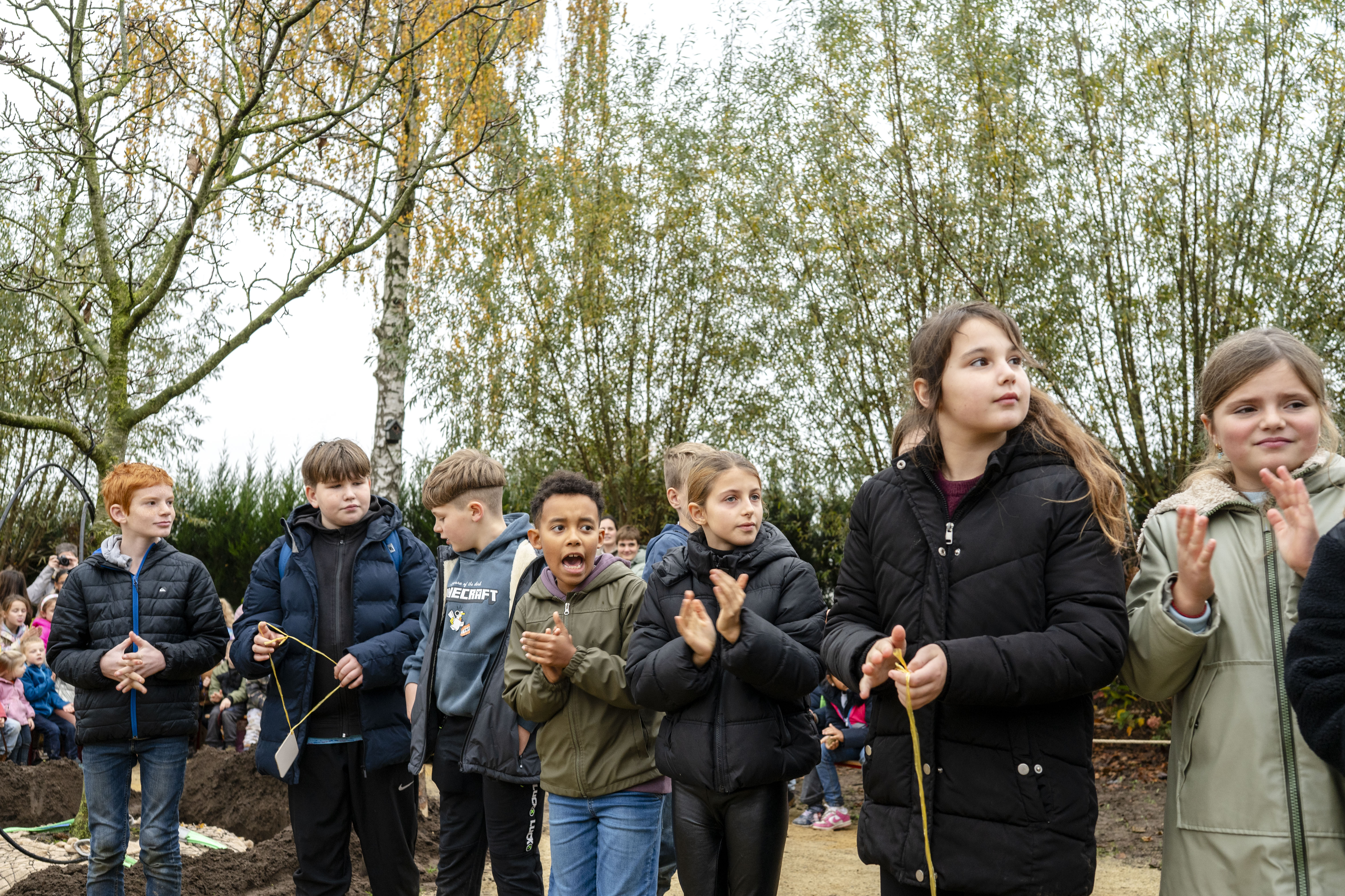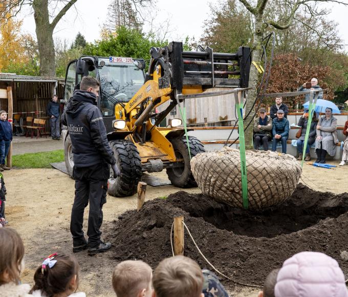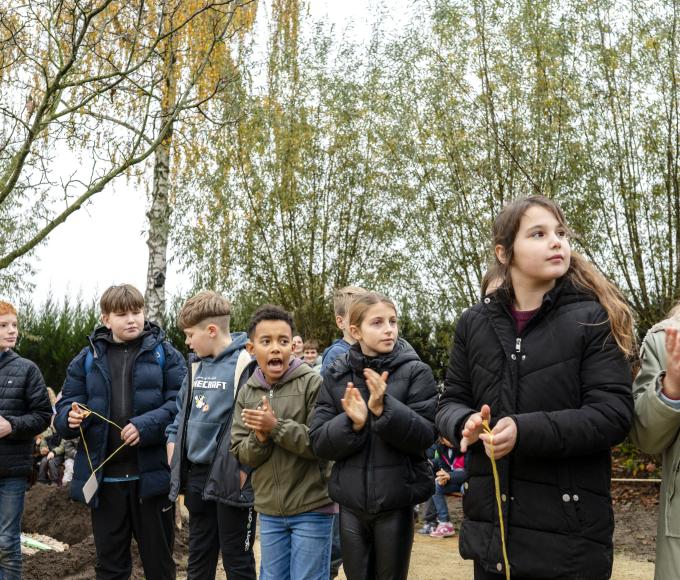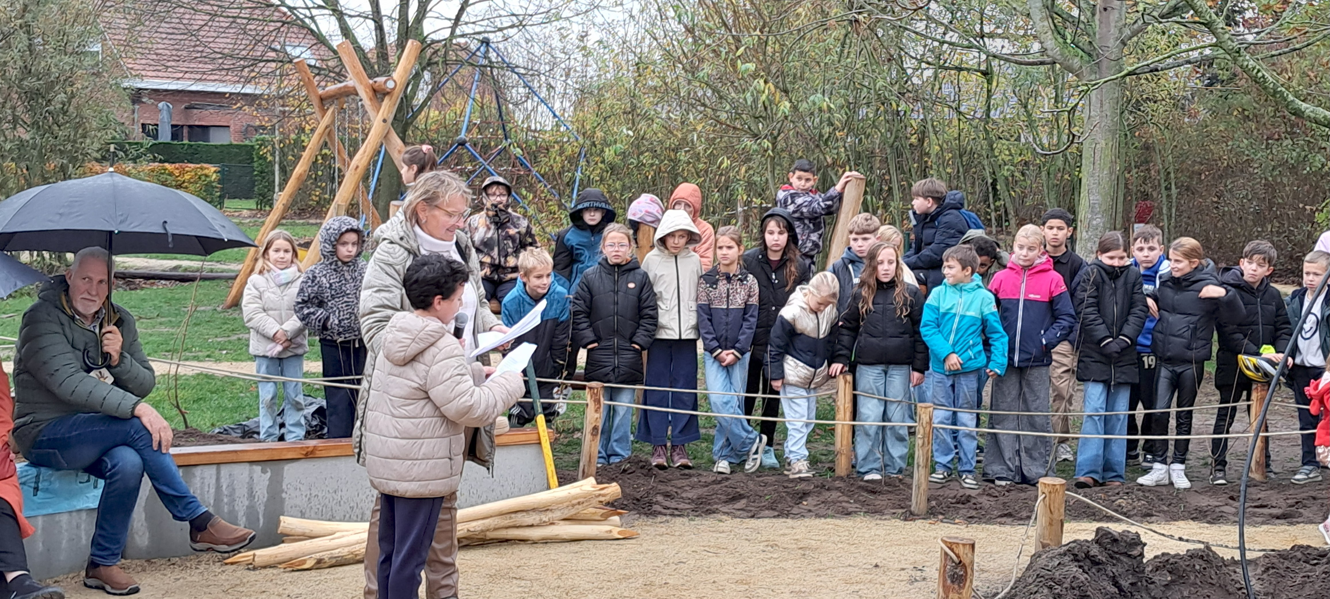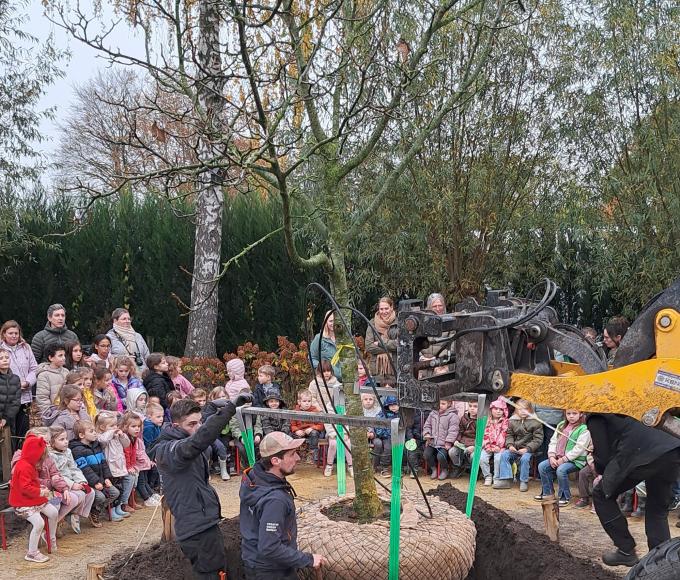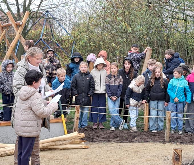 Een groene speeloase van dat formaat verdient een inhuldiging van hetzelfde kaliber. Daarom fietsten de leerlingen vanaf het derde leerjaar op vrijdag 14 november naar een bekende boomkwekerij in Loenhout en bracht een vijftien jaar oude notenboom mee naar hun speelplaats, waar die feestelijk werd aangeplant. Daarna volgde een gedicht van een leerling, een inhuldiging van de ‘speelhoeken’ en zongen de leerlingen het kinderlied.