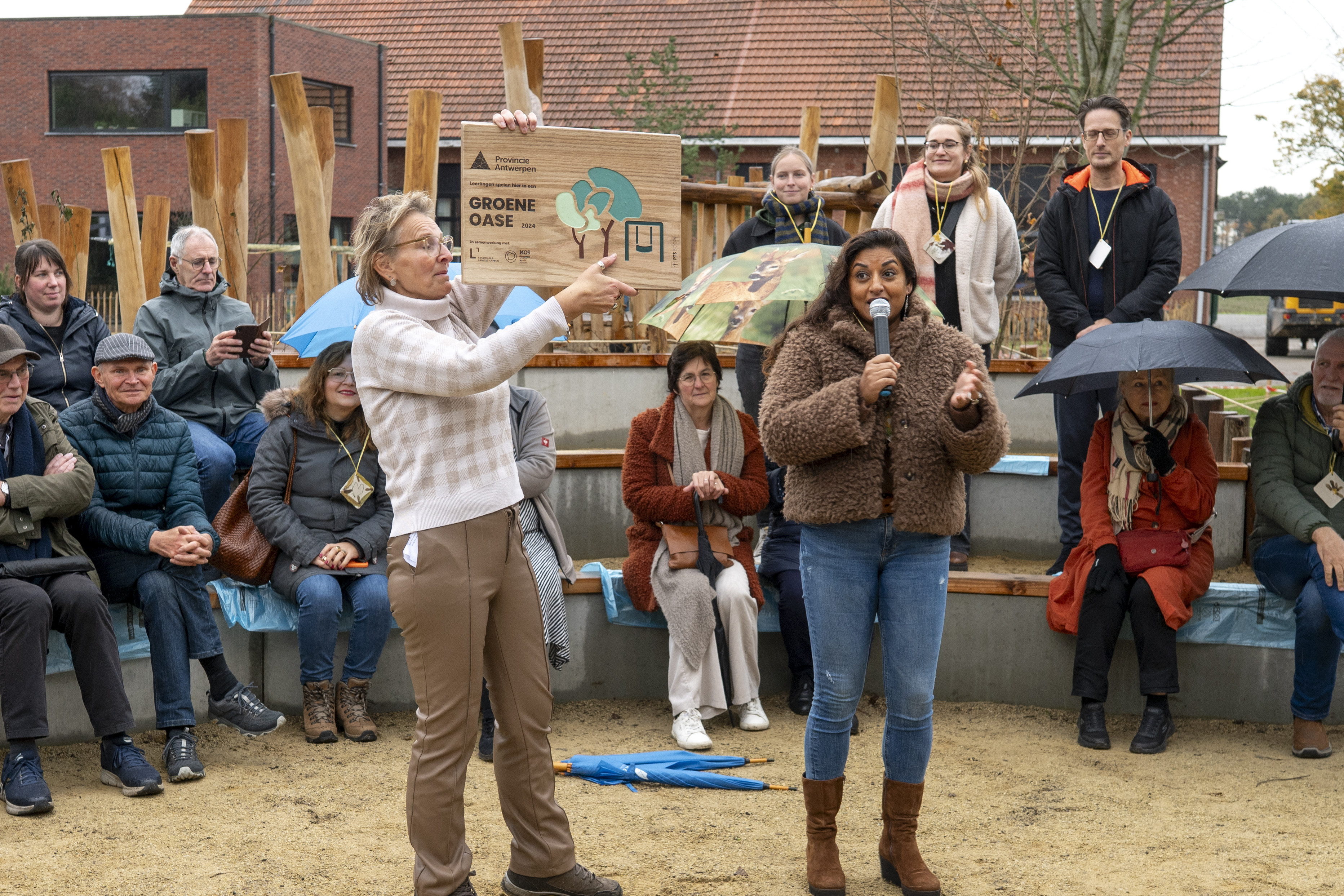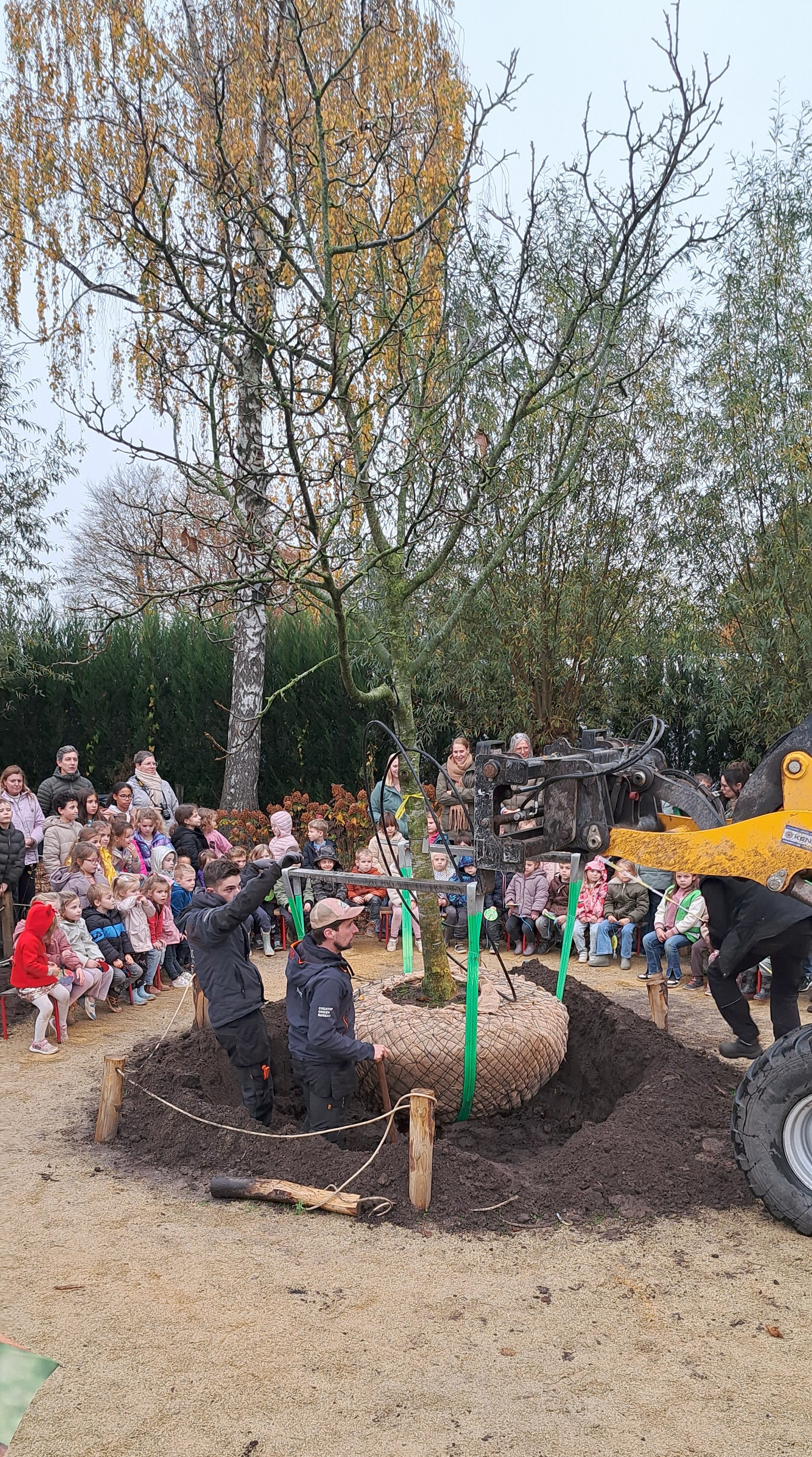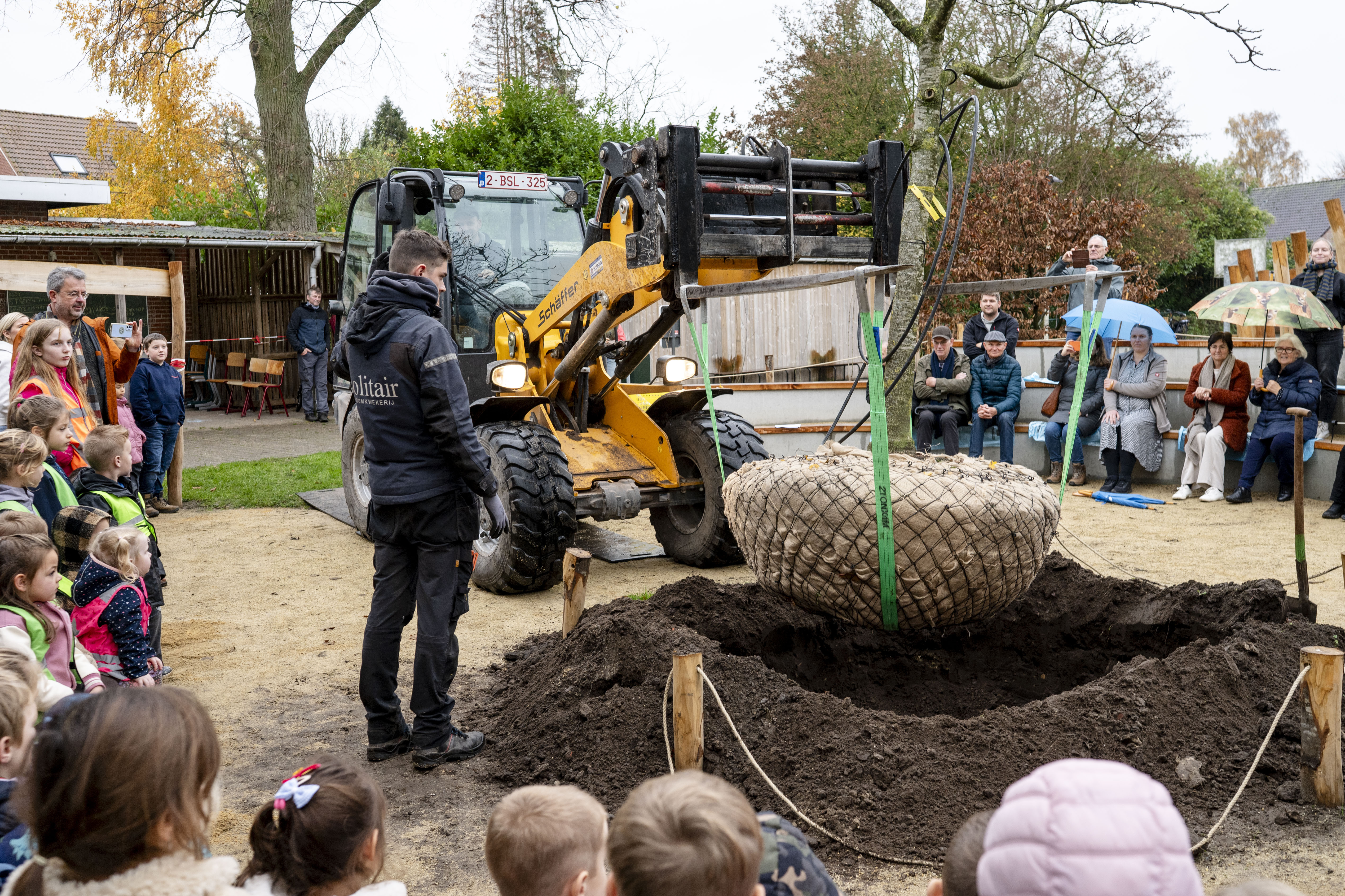 Een groene speeloase van dat formaat verdient een inhuldiging van hetzelfde kaliber. Daarom fietsten de leerlingen vanaf het derde leerjaar op vrijdag 14 november naar een bekende boomkwekerij in Loenhout en bracht een vijftien jaar oude notenboom mee naar hun speelplaats, waar die feestelijk werd aangeplant. Daarna volgde een gedicht van een leerling, een inhuldiging van de ‘speelhoeken’ en zongen de leerlingen het kinderlied.
