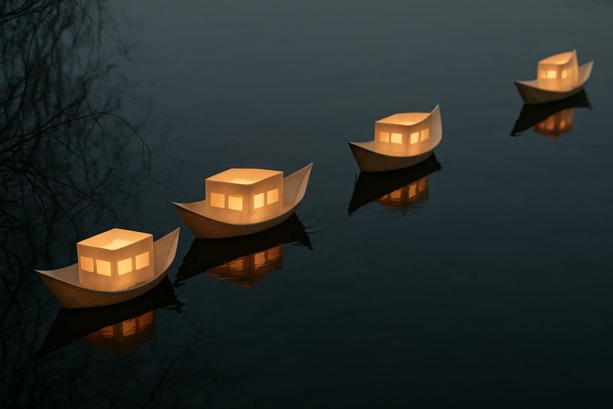 Samen papieren bootjes te water laten op Wereldlichtjesdag